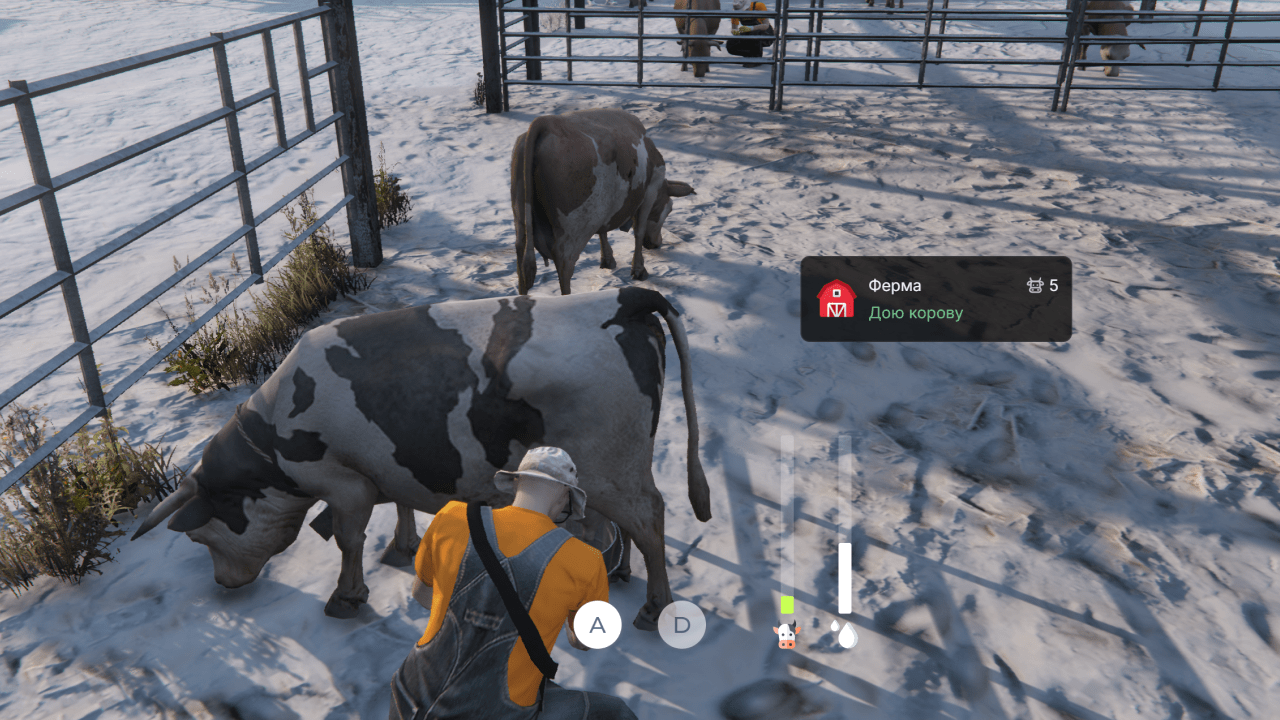 Одна из самых популярных активностей на ферме — дойка коров. Для этого нужно подойти к корове и решить мини-игру, где нужно последовательно нажимать клавиши и внимательно следить, чтобы не допустить переполнения индикатора раздражения коровы. В рамках сезонного пропуска также периодически появляются задания, связанные с активностями на ферме.