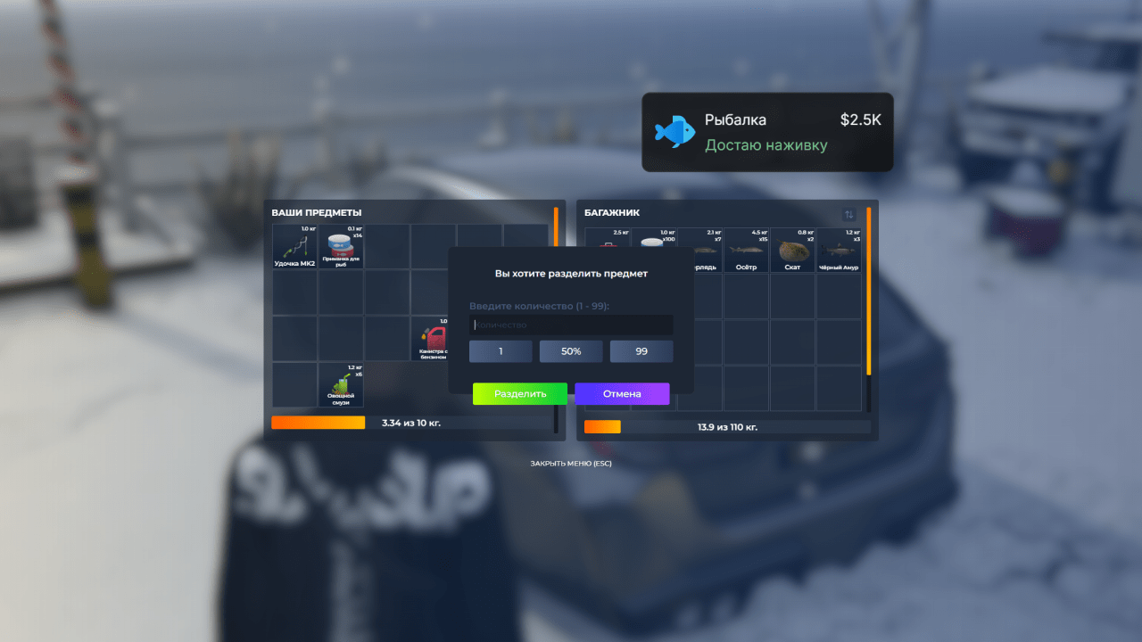 Пополнение наживки в инвентаре