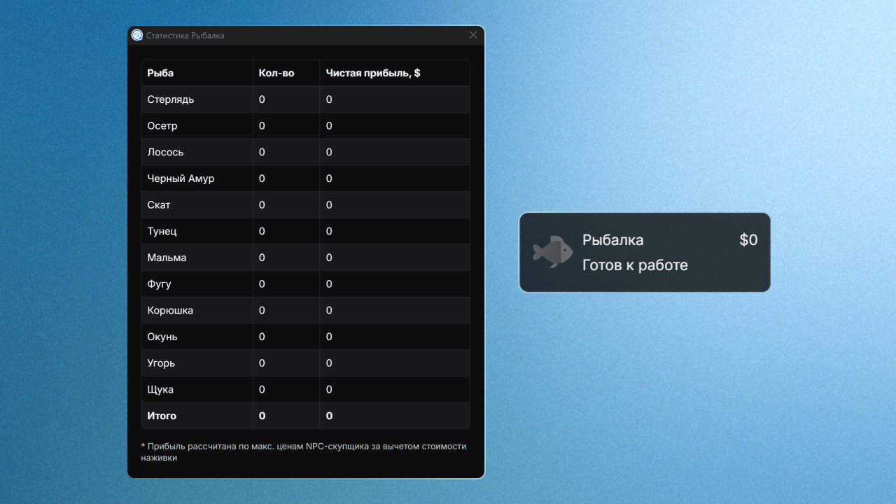 Подробная статистика улова по каждой рыбе и чистая прибыль