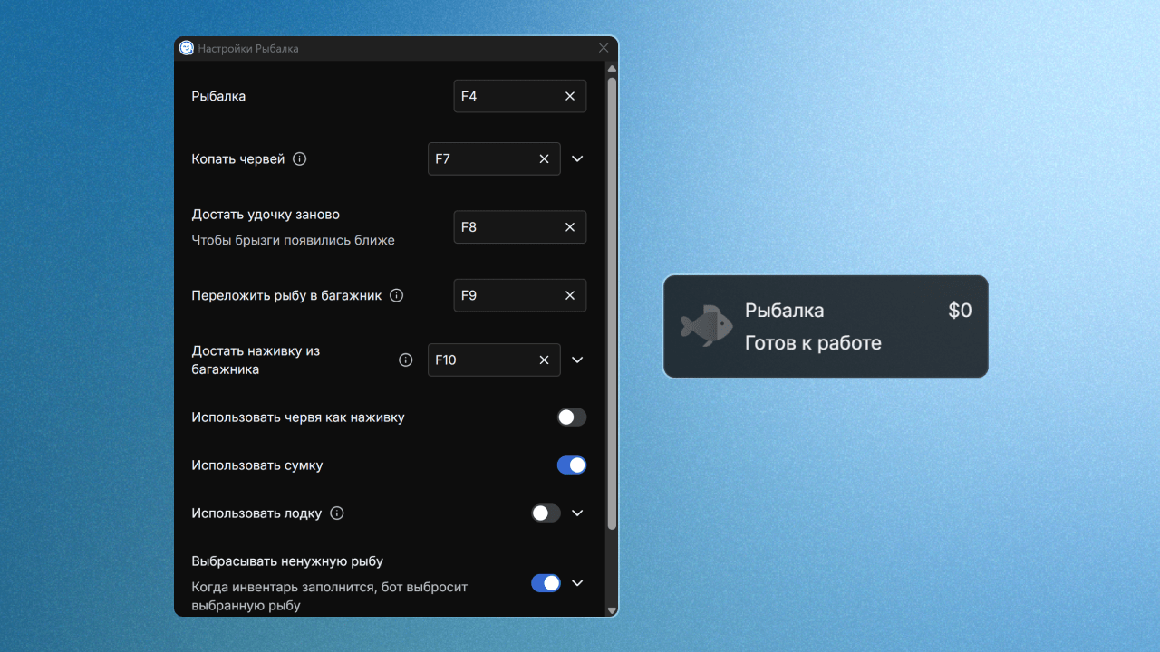 Важно: Бот не вытаскивает рыбу за вас и не решает мини-игру автоматически. Он помогает автоматизировать всё, что можно, чтобы сделать процесс рыбалки проще и удобнее.