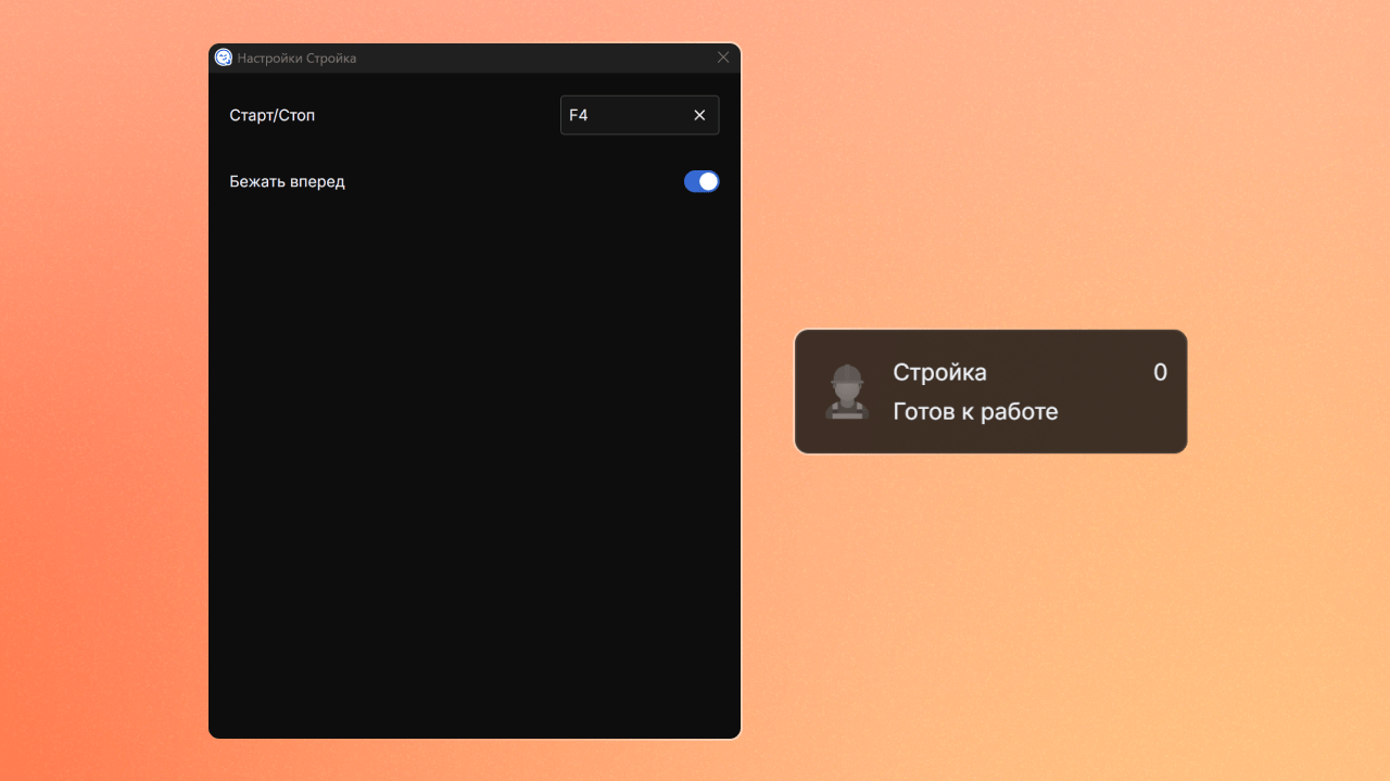 Наш бот для стройки упрощает этот процесс. Он решает мини-игру и зажимает бег вперед, снимая большую часть рутины. Остается лишь корректировать направление движения. Это позволяет меньше отвлекаться на однотипные действия и при необходимости заниматься чем-то параллельно. Бот также считает количество выполненных действий, чтобы было проще отслеживать прогресс.